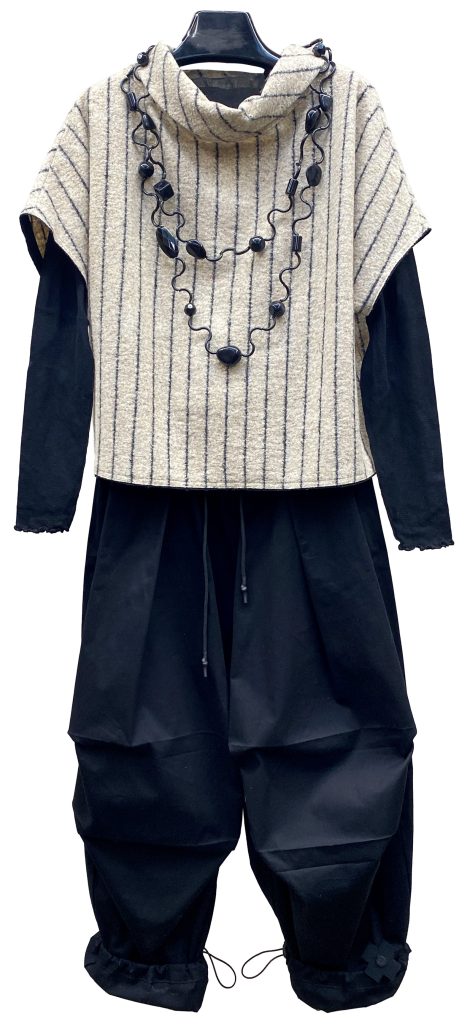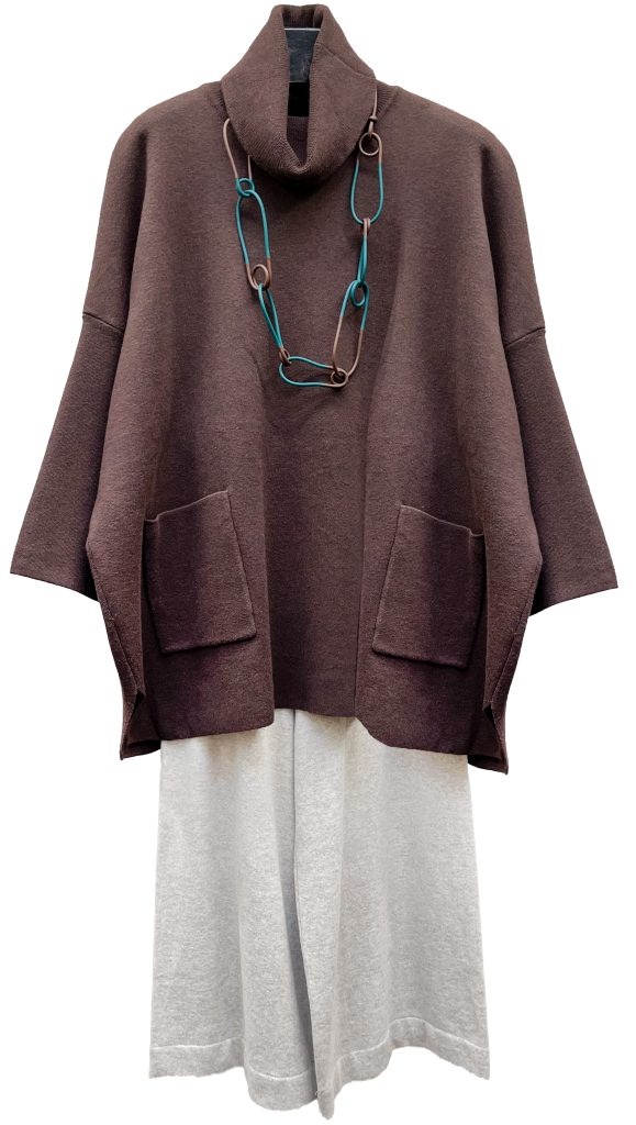 1 – Mama B cozy knit head to toe, featuring a mock neck pullover, wide leg pant and tuque.2 – Mama B cozy knit pullover with taffeta panel and matching Mama B crinkle skirt.3 – Mama B cozy knit top with crinkle insert, paired with Mama B French Terry barrel leg pant.4 – Detail view of top from above, in colour night.5 – Mama B cozy knit A-line top, styled with Mama B velvet pant and Christina Brampti necklace.6 – Mama B boxy textured pullover paired with Mama B barrel leg pant.7 – Mama B hooded pullover with Mama B French Terry barrel leg pant.8 – Mama B cozy knit one size cowl sweater paired with Mama B tapered velvet pant. Necklace by Christina Brampti.9 – Mama B cozy knit pocketed pullover styled with Mama B french Terry barrel leg pant. Necklace by Christina Brampti.