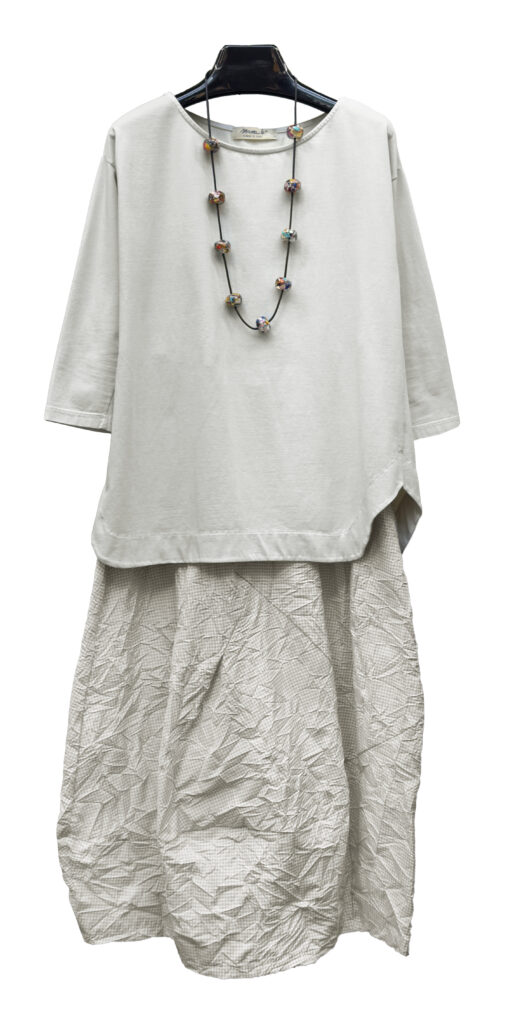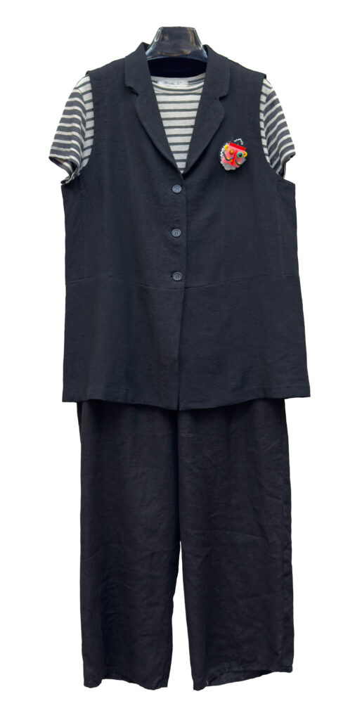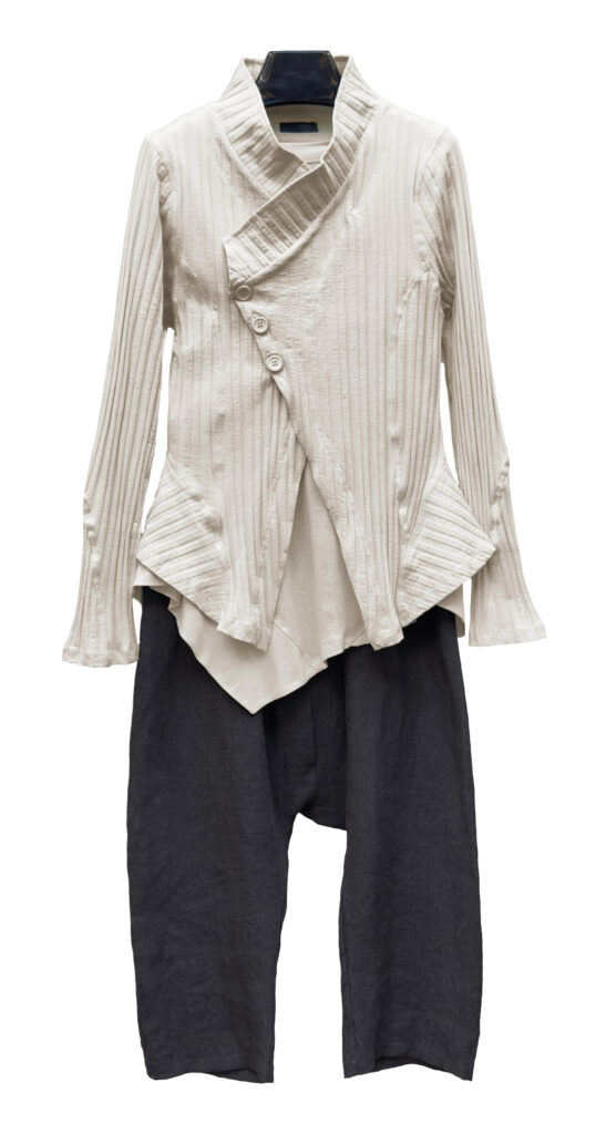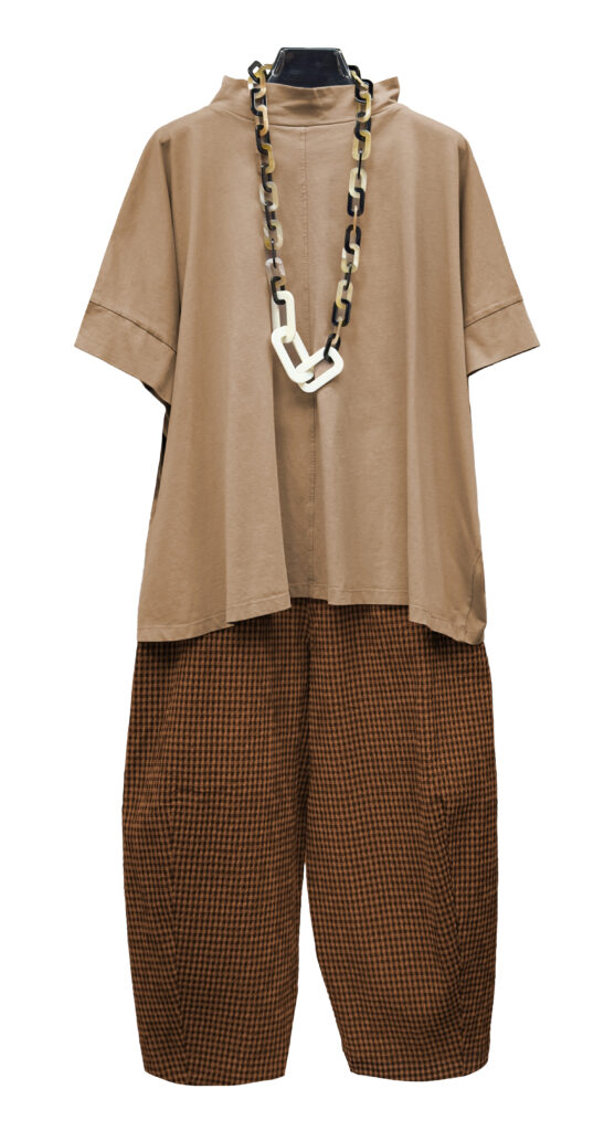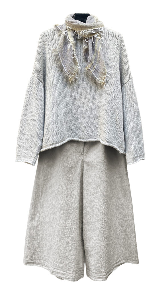 1 – Mama B linen blend ensemble of double stripe top, paired with Mama B drop rise pant.2 – Mama B linen blend double stripe cropped cardigan layered over Mama B jumpsuit.3 – Sort Aarhus fitted ribbed cardigan in greige (also available in black), styled over Sort Aarhus long sleeve top and Mama B drop rise linen pant.4 – Mama B pocketed crinkle check jacket, layered over Mama B 3/4 sleeve tee and cotton/ linen blend ankle pant.5 – Neirami knit sweater and wide leg culotte ensemble accessorized with small Tamaki Niime scarf.6 – Mama B A-line tee, layered over Mama B crinkle check skirt.7 – Mama B Linen blend soft A-line top, paired with Mama B linen barrel leg pant.8 – Mama B relaxed linen blend vest, styled over Mama B linen blend tee and Motion Linen floods.9 – Sort Aarhus fitted ribbed cardigan in black, paired with matching Sort Aarhus ribbed pant.10 – Sort Aarhus French Terry relaxed boxy top, layered over Sort Aarhus bubble skirt.11 – Sort Aarhus matching taupe ensemble, featuring relaxed mock neck pullover and bubble skirt from above.12 – Sort Aarhus relaxed mock neck top from above, styled with Neirami cropped seersucker pant.