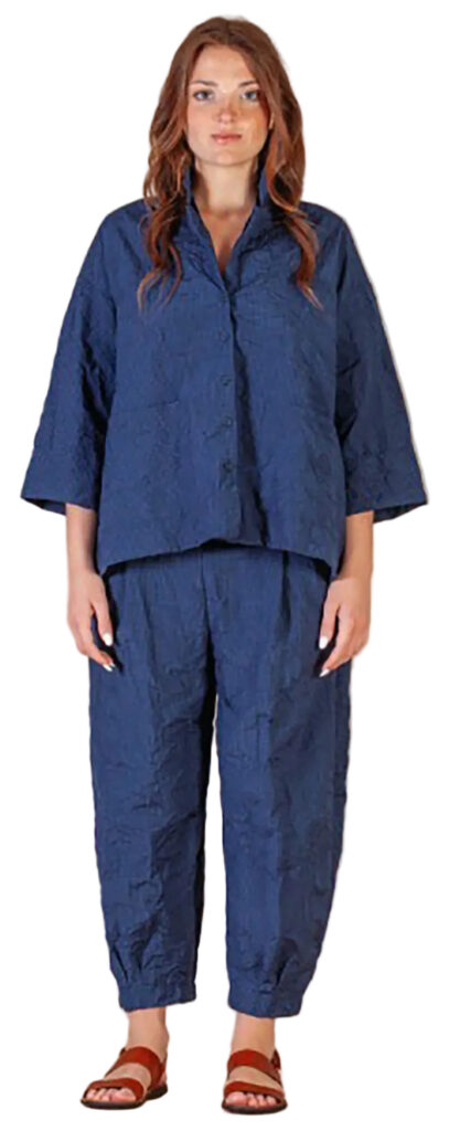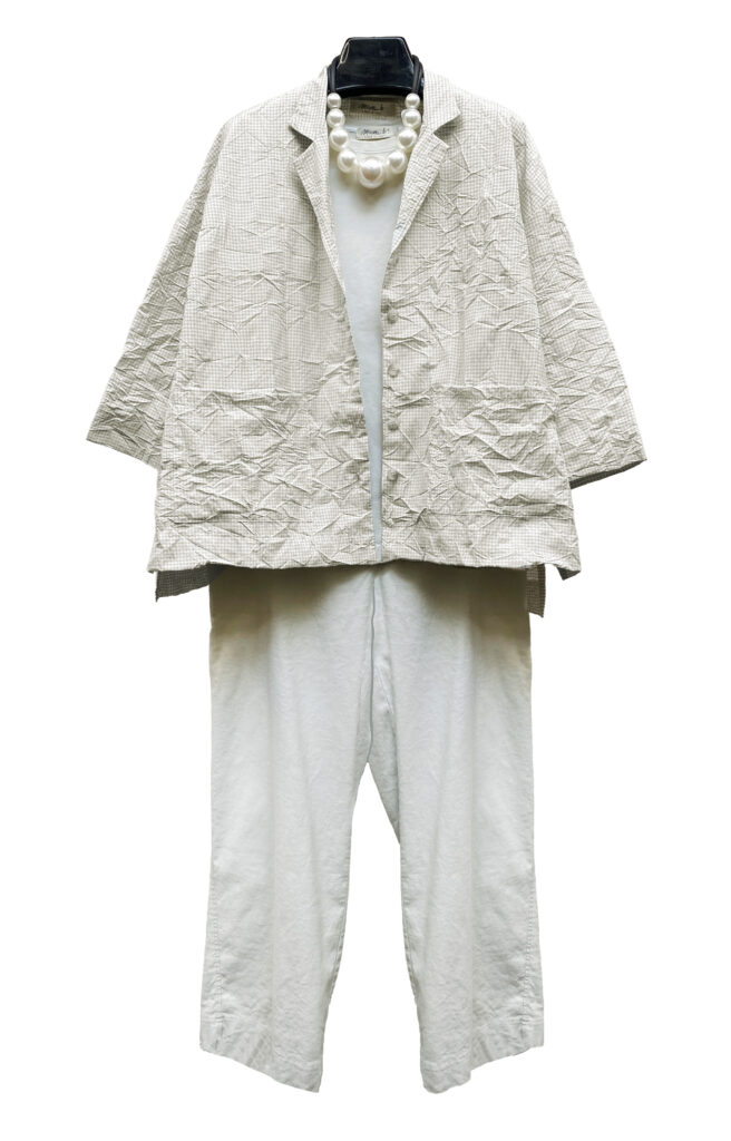 1 – Mama B cotton ensemble featuring a crinkled fitted jacket and drop rise pant in anthracite print.2 – Mama B jacket and pant from above, styled with anthracite 3/4 length sleeve A-line tee and Christina Brampti necklace.