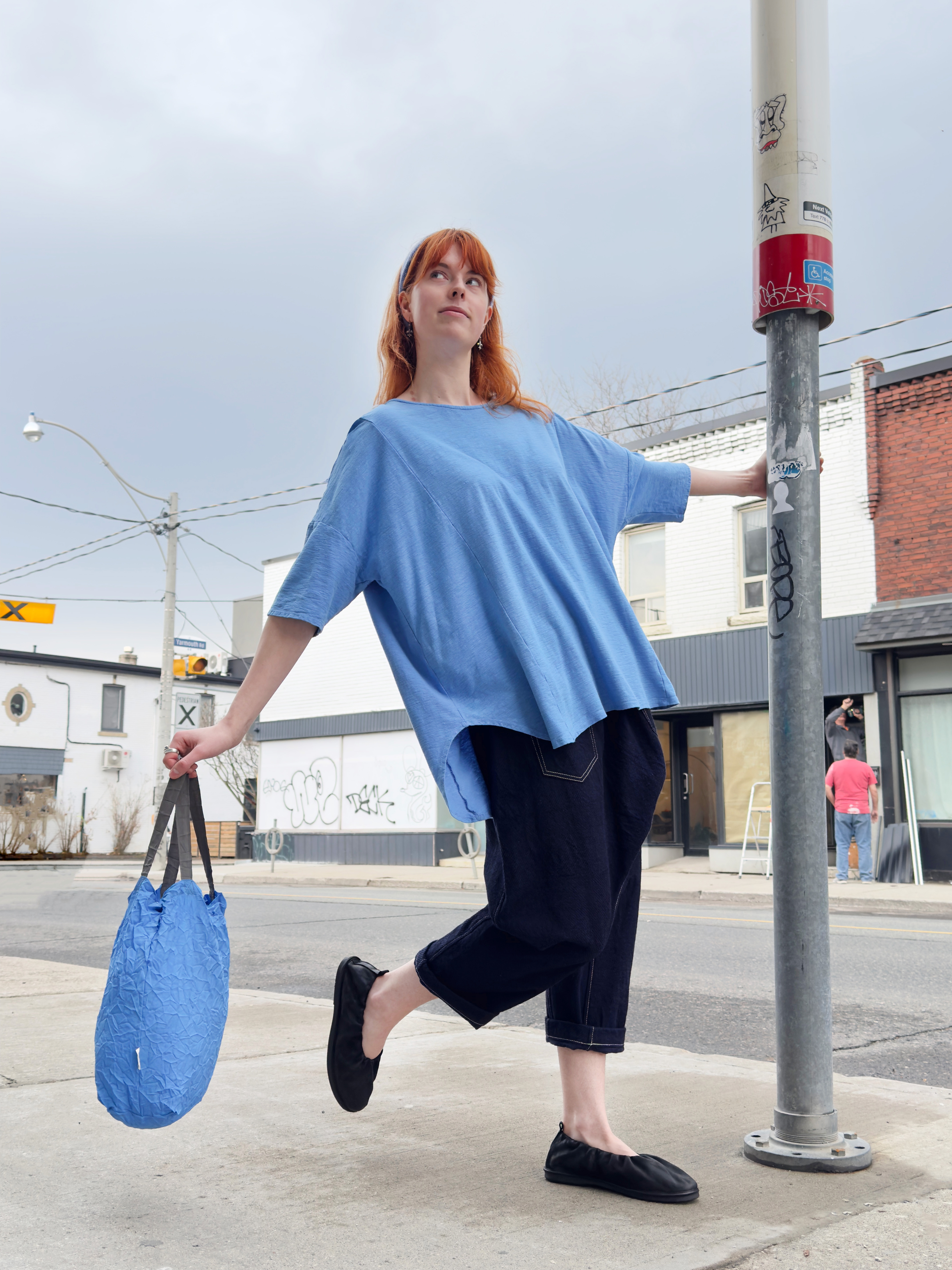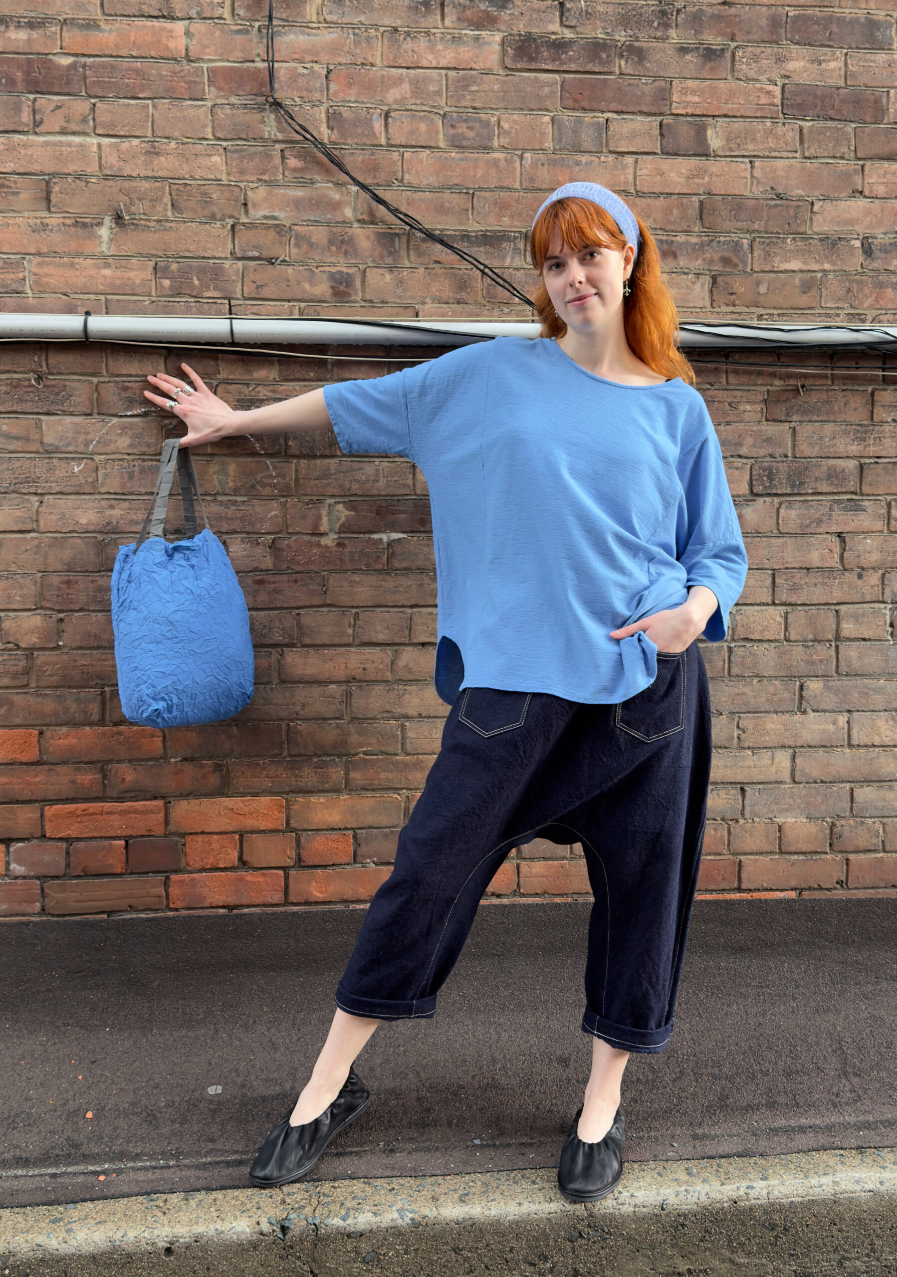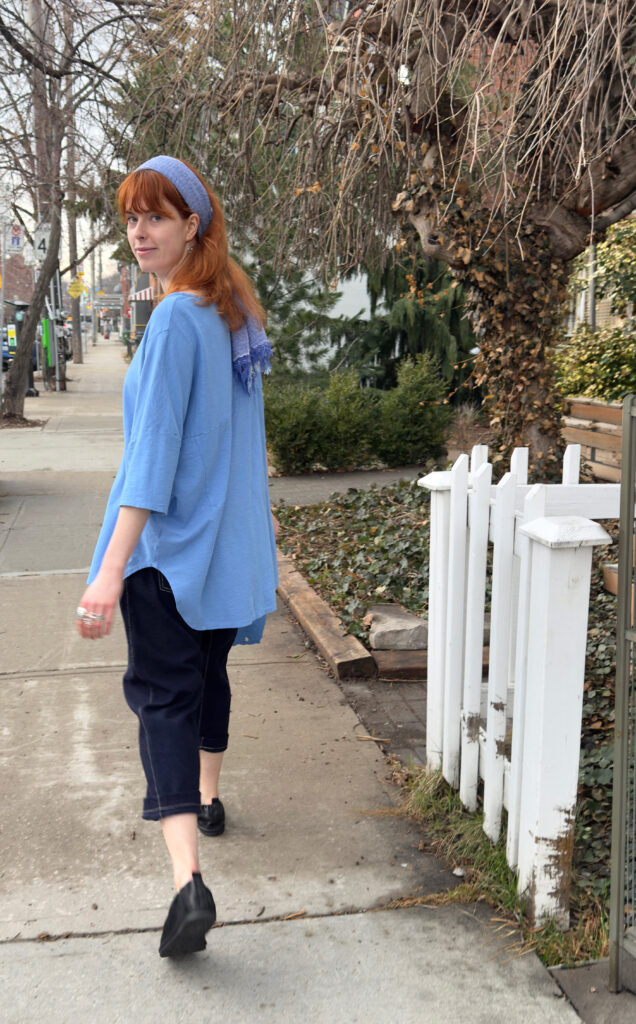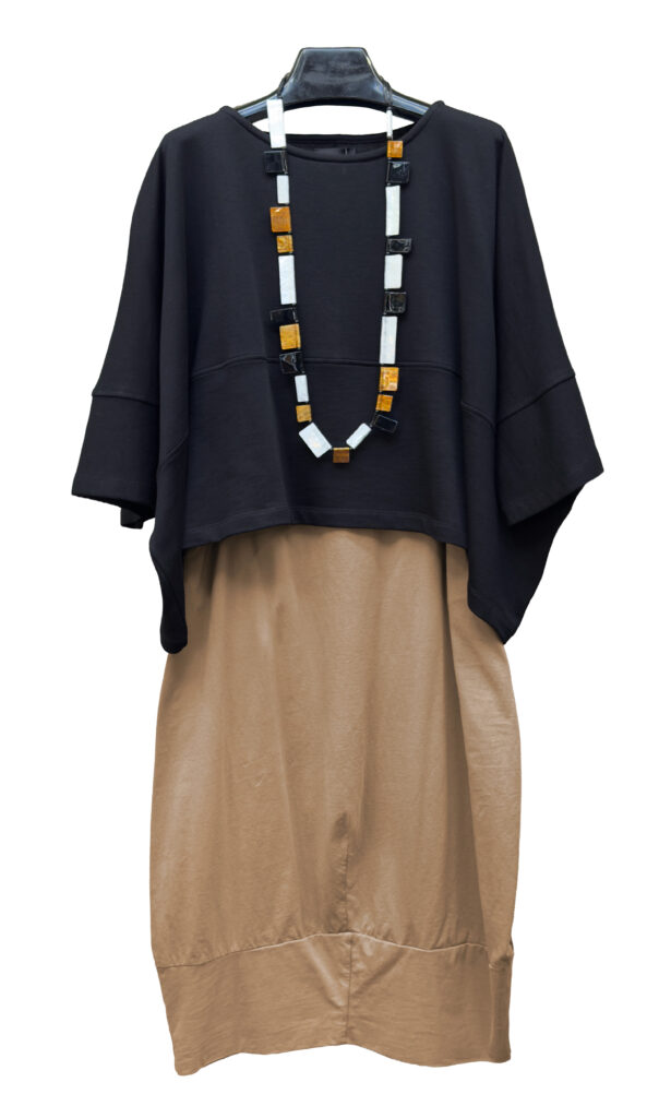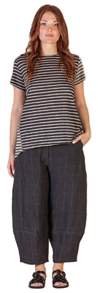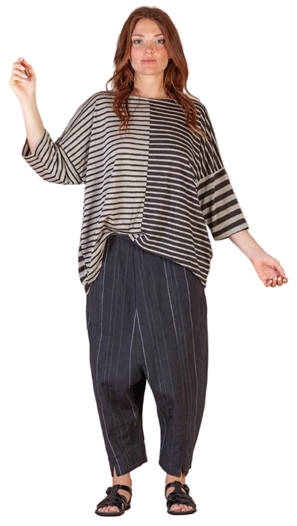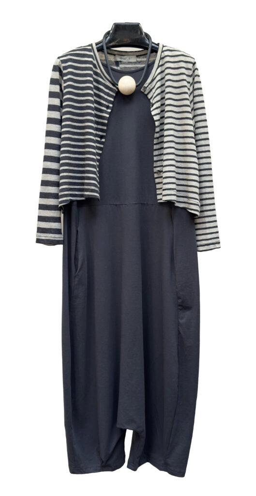 3 – Back view of above.4 – Mama B crinkled fitted jacket over cotton jersey knit jumpsuit in anthracite, also available in black and cumino.5 – Mama B 3/4 length sleeve A-line tee in navy, limestone and anthracite..6 – Mama B one-size dropped shoulder tee (also available in blue and black), paired with barrel leg linen pant.