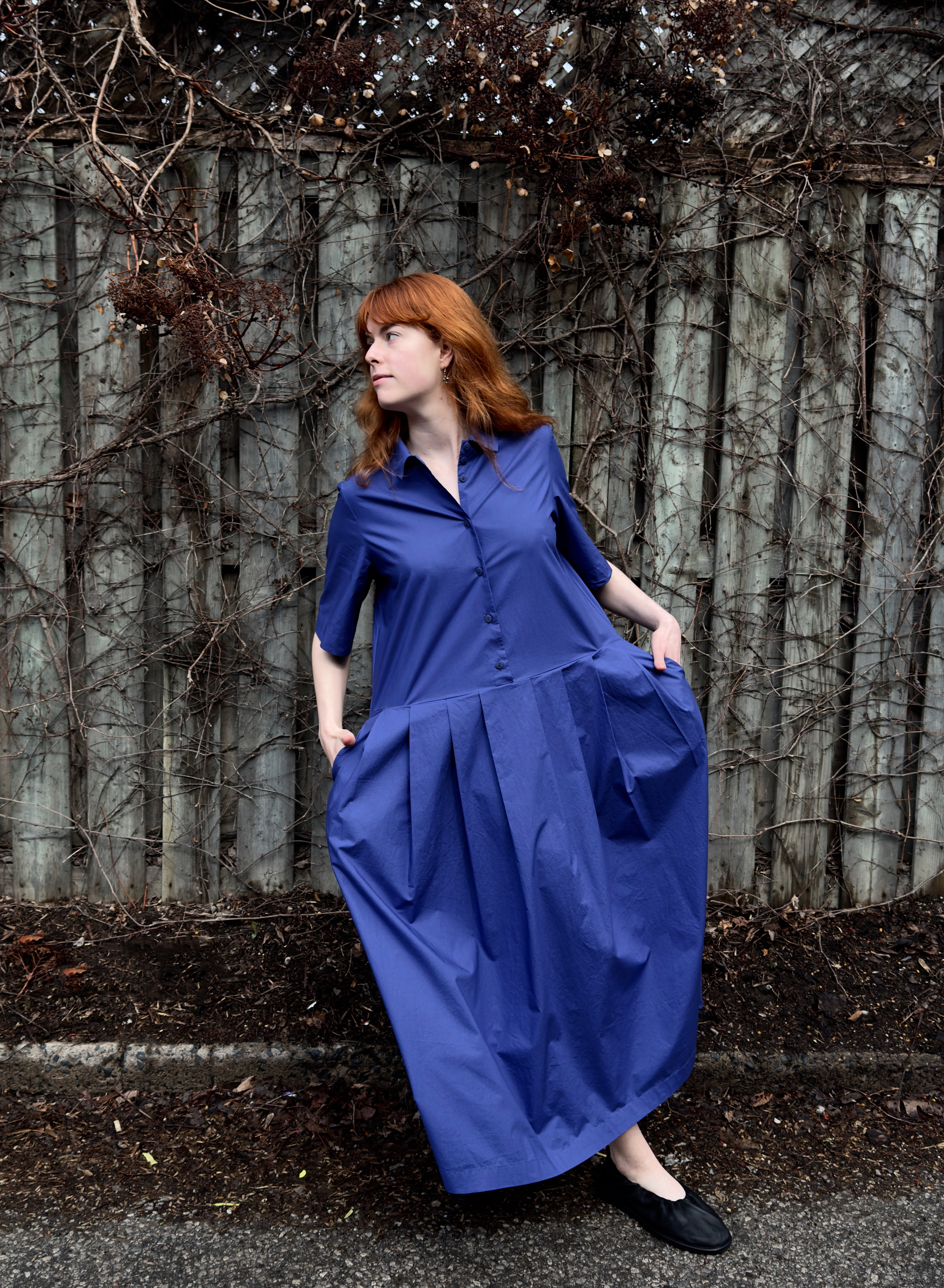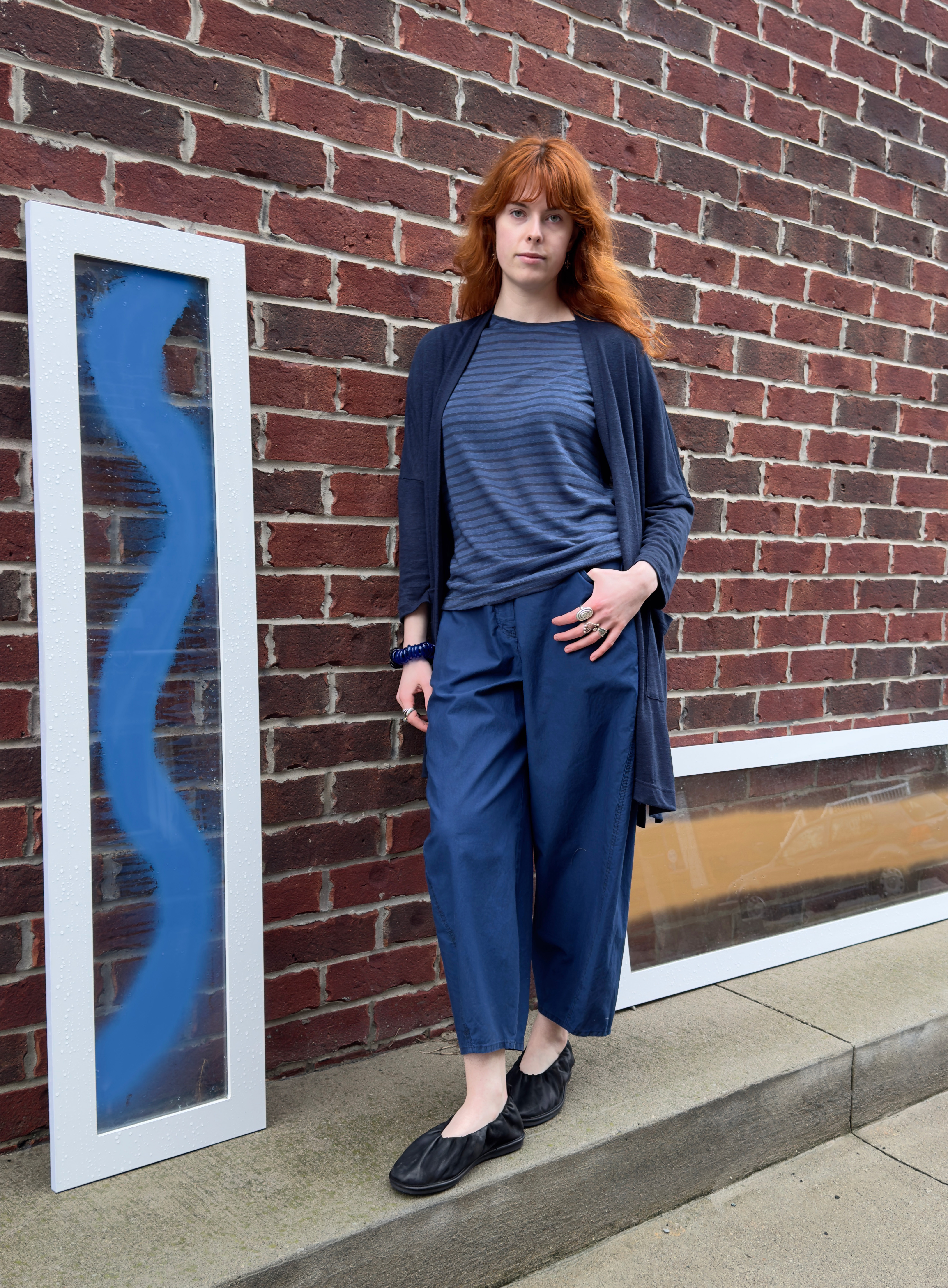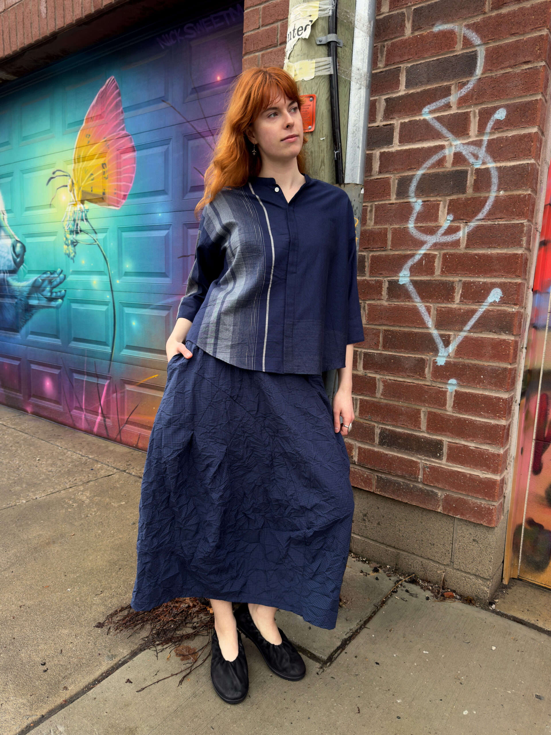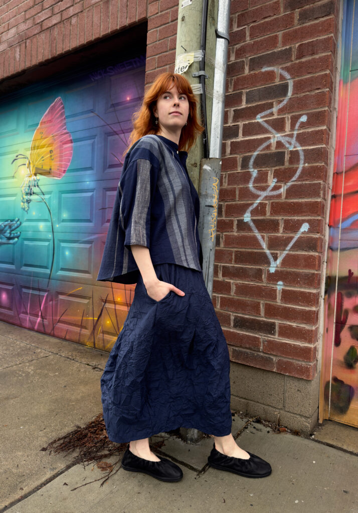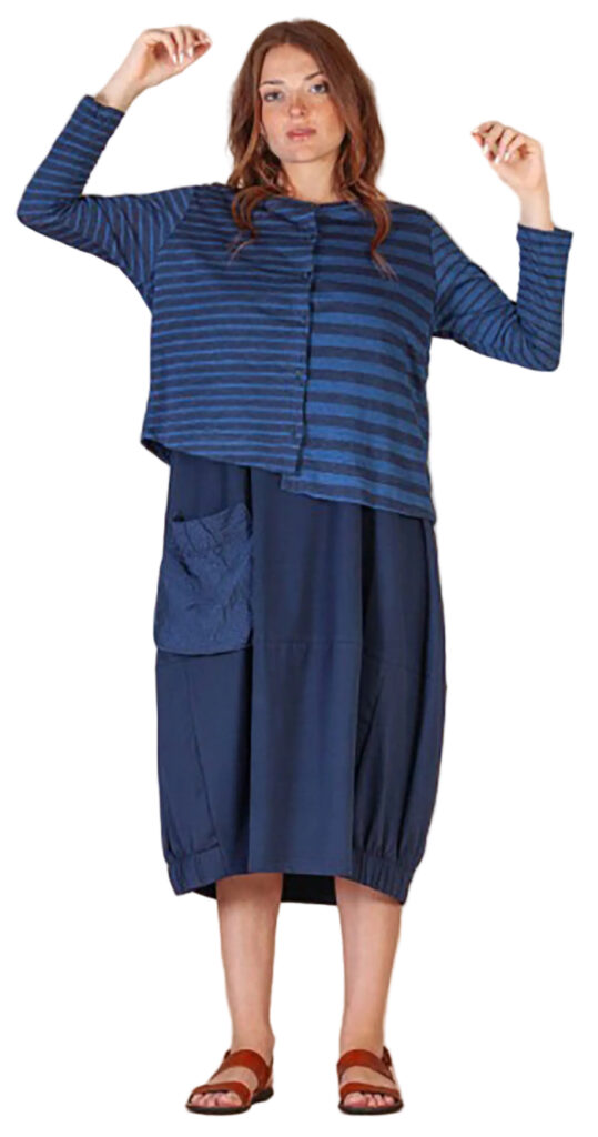 1 – Neirami pleated cotton midi dress.2 – Full front view of above.3 – Pleating & pocket detail view of above.4 – Back view of above.5 – Tamaki Niime mandarin collar cotton shirt, paired with Mama B crinkled check-pattern skirt.6 – 3/4 view of above.7 – Back view of above.8 – Motion one-size double seam top, styled with Tamaki Niime drop-rise denim pant and crumple bag. Small scarf worn in hair by Tamaki Niime.9 – Posed view of above.11 – Full front view of above.12 – Back view of above. P.s. Try styling your small Tamaki Niime scarves in your hair!13 – A cohesive monochrome blue look from Oska, featuring their long ribbed knit pullover, and ankle length pant. Necklace by Samuel Coraux.14 – Front view of above.15 – Back view of above.16 – Mama B linen blend cardigan, layered over Mama B stripped linen blend tee, and Oska cropped barrel leg pant. Bracelet by Samuel Coraux.17 – View of above without cardigan.18 – Mama B matching jacket and pull on pant in a crinkled check fabric.19 – Mama b linen bled dual stripe cardigan, layered over Mama B cocoon cotton jersey knit dress.
